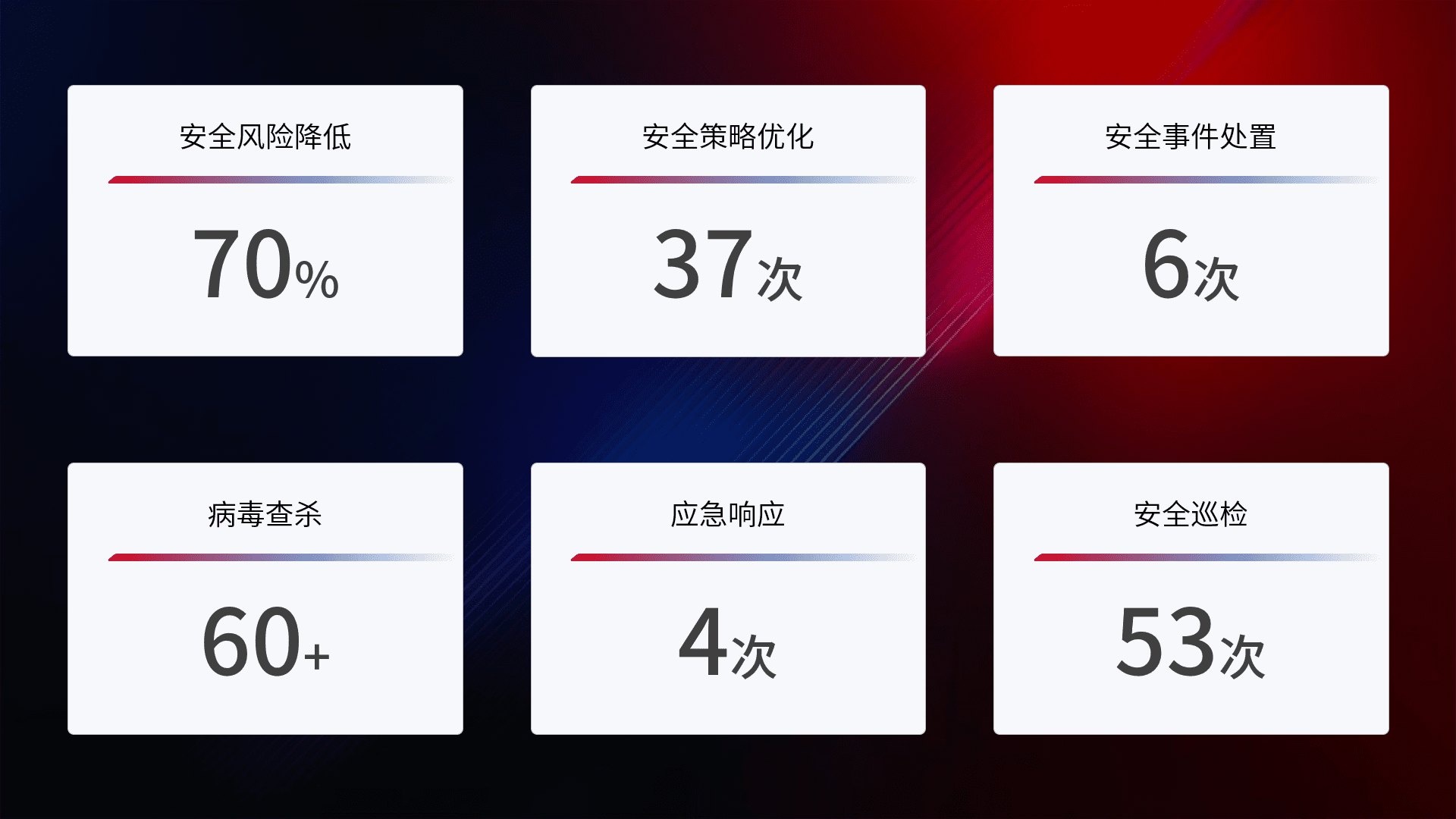 提供全面的安全事件报告体系,,,包括处置报告、、、、周报、、、、季度和年度总结,,,,结合持续监控,,,,帮助客户深入了解网络安全状况。。。。